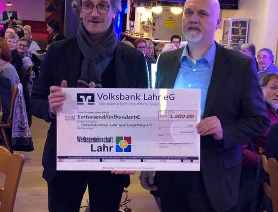 Bei unserem Neujahrshock im Restaurant zum Zarko in Lahr konnte dieses Jahr die Lahrer Werbegemeinschaft dem Tierheim Lahr eine Spende über 1500 € überreichen.